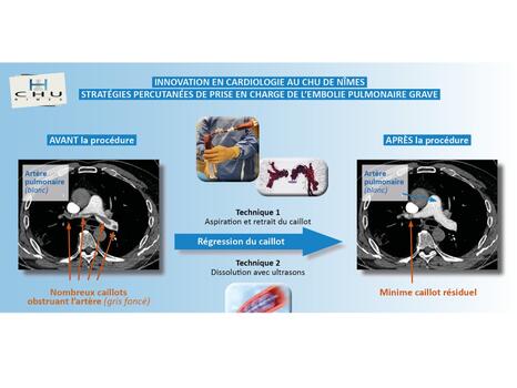 En plus du traitement médical, il existe désormais deux techniques différentes permettant de retirer le caillot situé entre le cœur et les poumons sous anesthésie locale à partir d’une piqûre d’une veine (au niveau du cou ou du pli de l’aine) sans nécessité d’opération chirurgicale ; l’une d’elle permettant l’aspiration du caillot (thrombectomie) et l’autre l’utilisation d’ultrasons directement dans l’artère pulmonaire pour faciliter sa dissolution (thrombolyse in situ). « Il s’agit d’une réelle avancée pour les patients souffrant de cette pathologie potentiellement mortelle, les premiers registres internationaux mettant en avant une réduction significative de la mortalité avec un risque de décès jusqu’à dix fois plus faible pour les formes les plus graves, en comparaison d’un traitement conventionnel sans thrombectomie percutanée » indique le Professeur Benoît Lattuca, cardiologue au CHU de Nîmes.