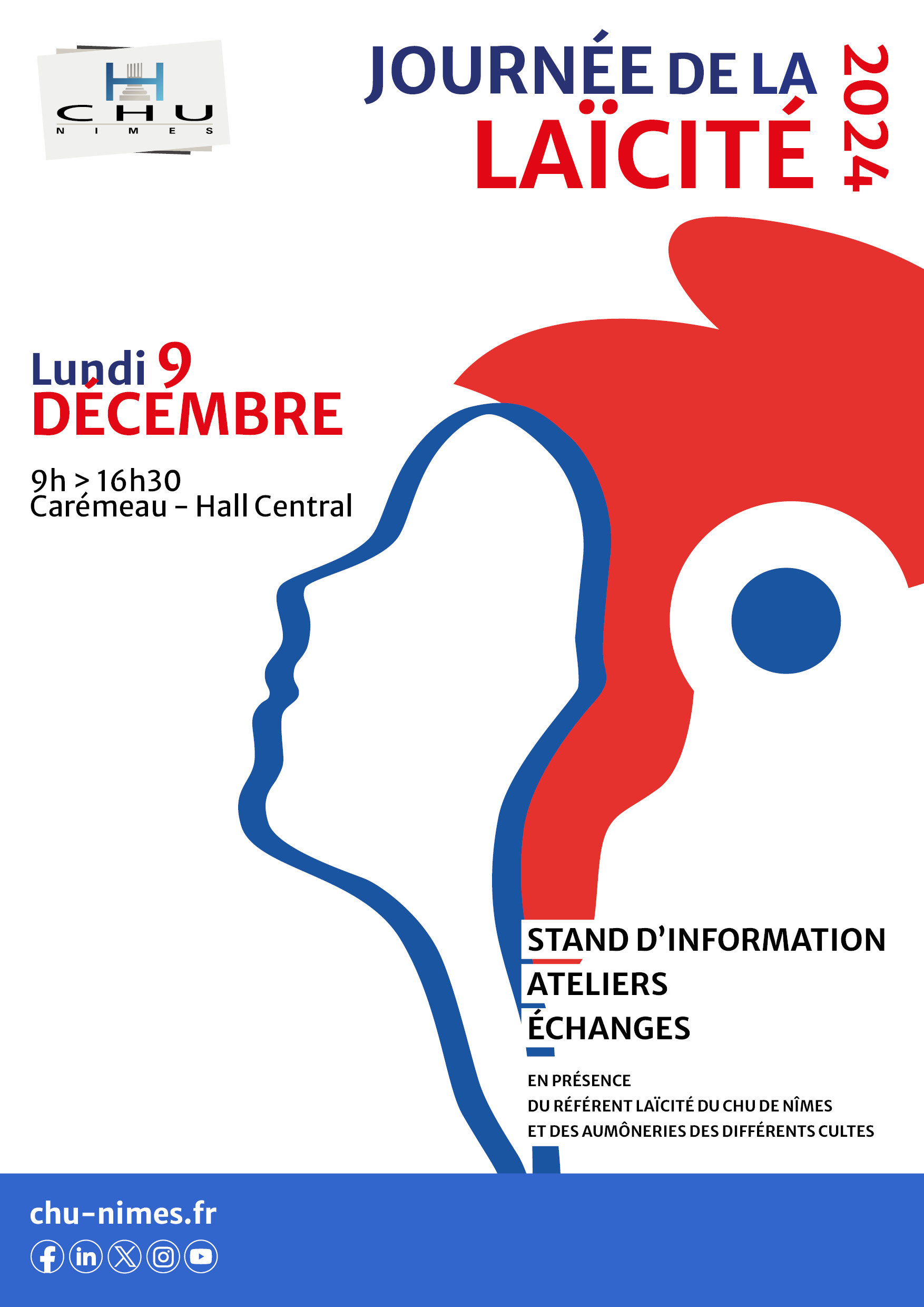 En présence des aumôneries hospitalières des différents cultes et du référent Laïcité du CHU de Nîmes, cette Journée d'échange et de partage aura pour objectif d'éclaircir un concept républicain qui peut parfois paraître abstrait mais qui pourtant structure concrètement l'égalité de toutes et tous. Des quiz sur la Laïcité seront mis à disposition des patients, usagers et personnels hospitaliers et une vidéo sera projetée pour parfaire sa connaissance républicaine.