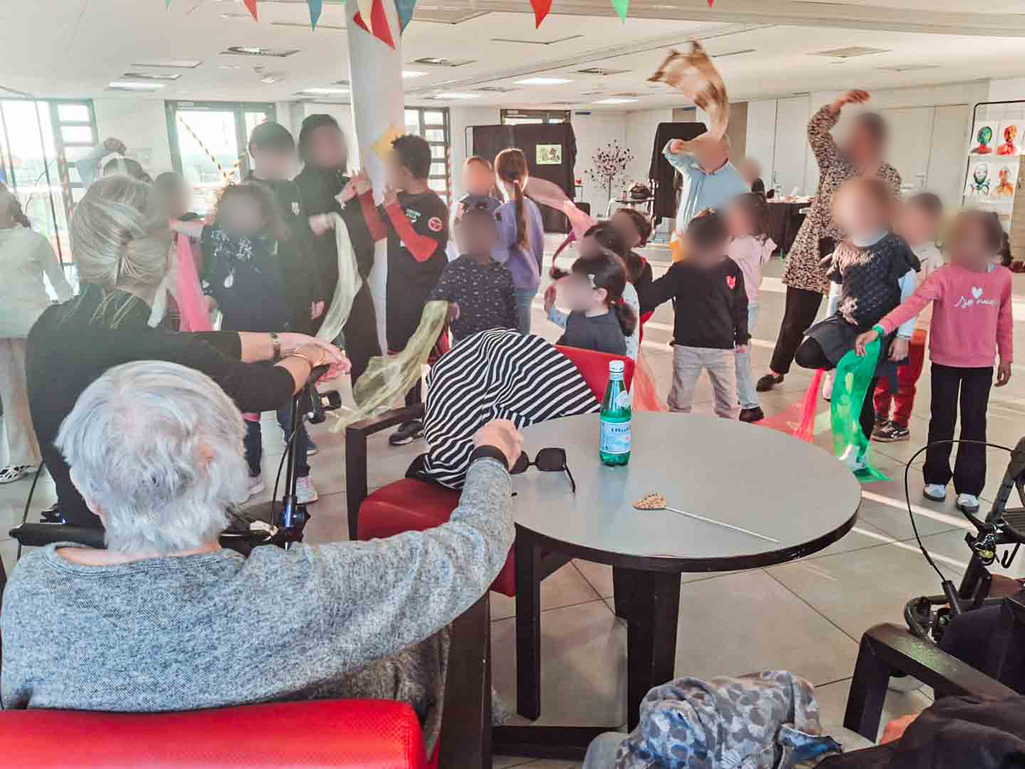 L’après-midi, la salle commune s’est transformée en une véritable scène vivante où enfants et seniors ont partagé une activité de danse en mouvement. Avec des foulards colorés, les participants ont improvisé des chorégraphies collectives au son d’une musique entraînante. L’énergie communicative des plus jeunes a su entraîner les aînés dans un moment de complicité et de joie partagée.
