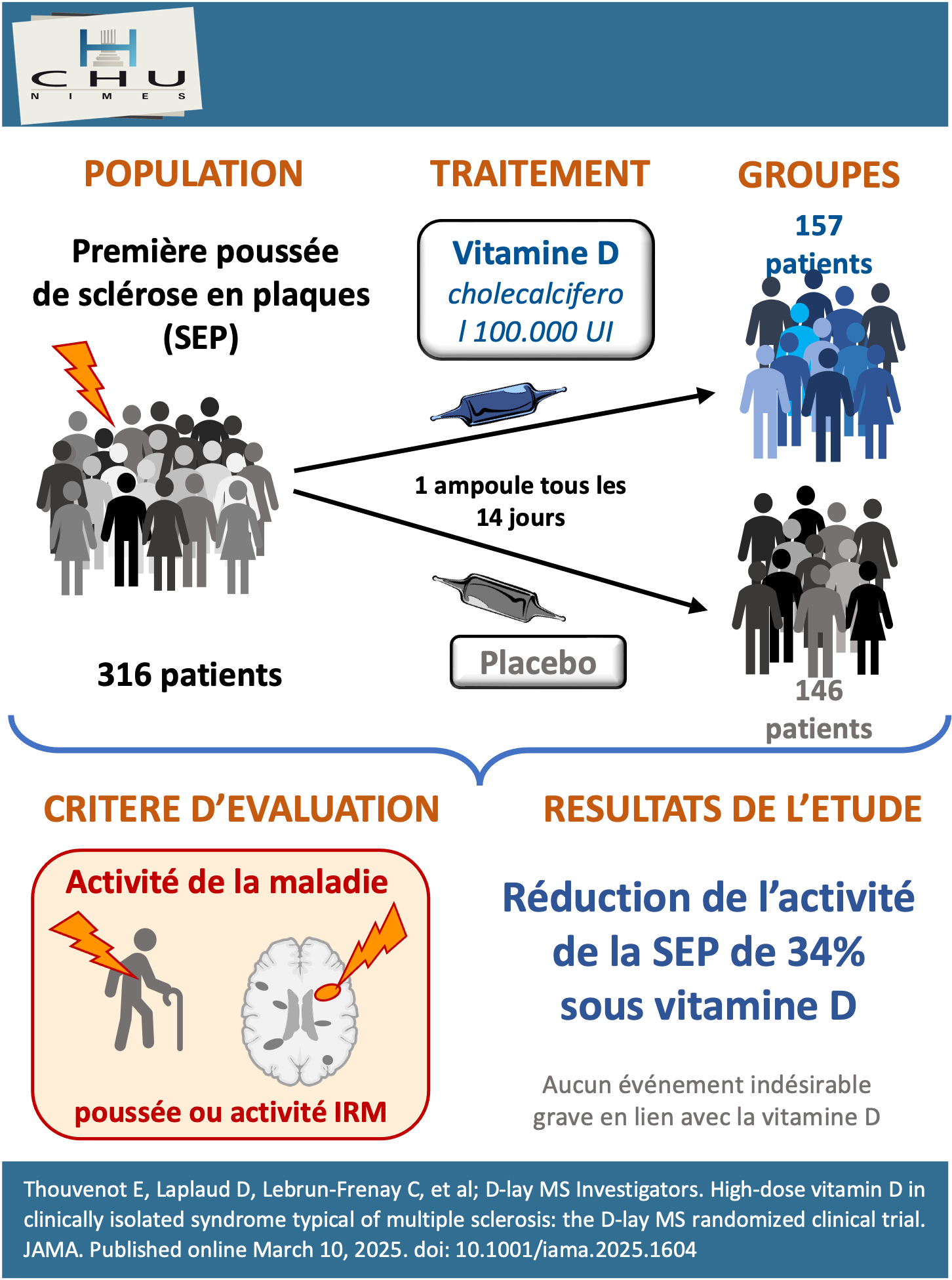 Étude D-Lay-MS - l’utilisation de la vitamine D dans le traitement de la sclérose en plaques Publié le 10.03.25 2025-03-10_cp_pr_thouvenot_resultats_projetd-layms.pdf pdf - 575.68 Ko Lire la publication Liens utiles Publication Article JAMA 2016 – 2026 : 10 années de cancérologie au CHU de Nîmes Inauguré le 19 février 2016, l’Institut de Cancérologie du Gard célèbre ses 10 ans. À cette occasion, le CHU de… Communiqué de presse : 10 années de Cancérologie au CHU de Nêmes pdf - 242.04 Ko Lire la publication Rapport d'activité 2024 L’année 2024 s’achève et laisse derrière elle une trajectoire résolument tournée vers l’excellence, la modernisation et l’ouverture. Rapport d'activité 2024 - CHU de Nîmes pdf - 6.02 Mo Lire la publication Afflux de patients durant le pic épidémique hivernal : le CHU de Nîmes continue de mobiliser tous les leviers disponibles en soutien à l’ensemble des équipes mobilisées 2026-01-22-cp-situation-urgences.pdf pdf - 284.59 Ko Lire la publication